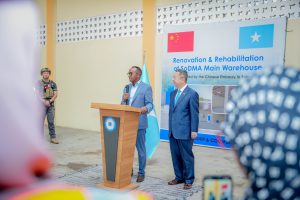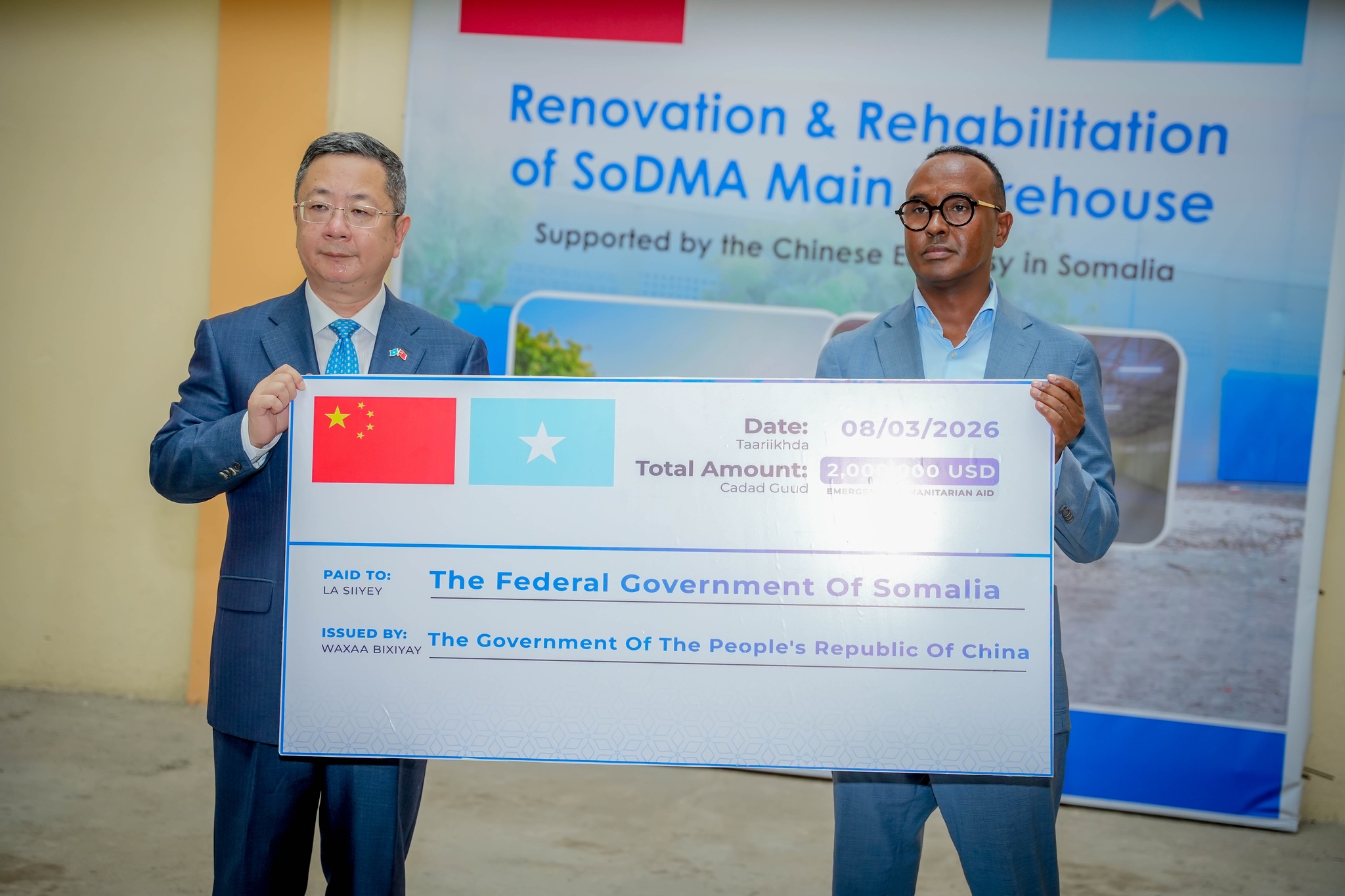 The Commissioner of the Somali Disaster Management Agency (SoDMA), Mr. Mahmoud Moallim Abdulle, officially received the donation from the Chinese Ambassador to Somalia, Mr. Wang Yu. The contribution includes $2 million in cash assistance and food aid intended to help communities impacted by the ongoing drought across the country.