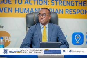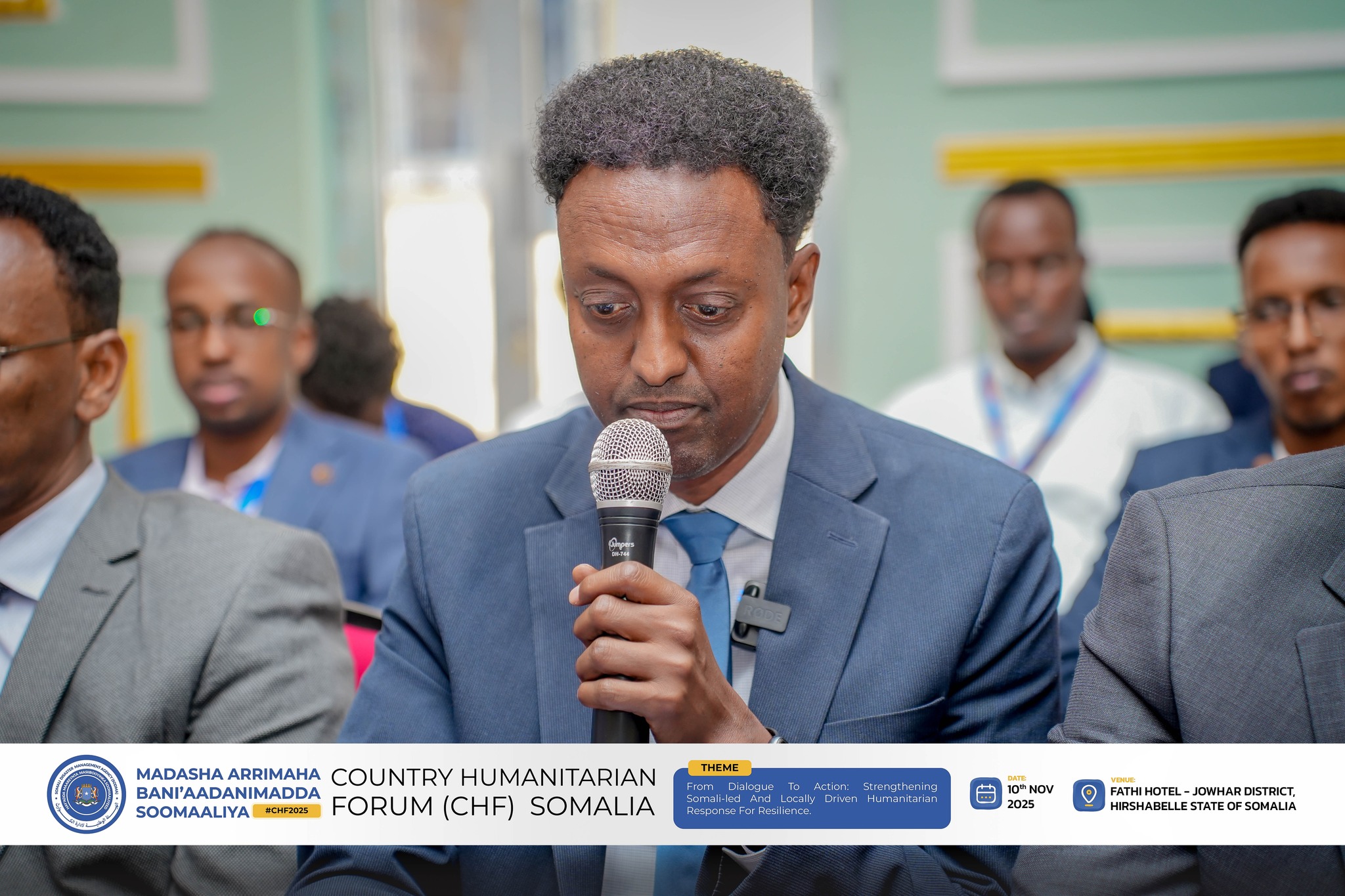 The Minister of Humanitarian Affairs and Disaster Management of Northeast State, Mr. Abdirizaq Hindi, speaking on behalf of all federal member state ministers of humanitarian affairs, addressed the 9th Country Humanitarian Forum (CHF) held in Jowhar.