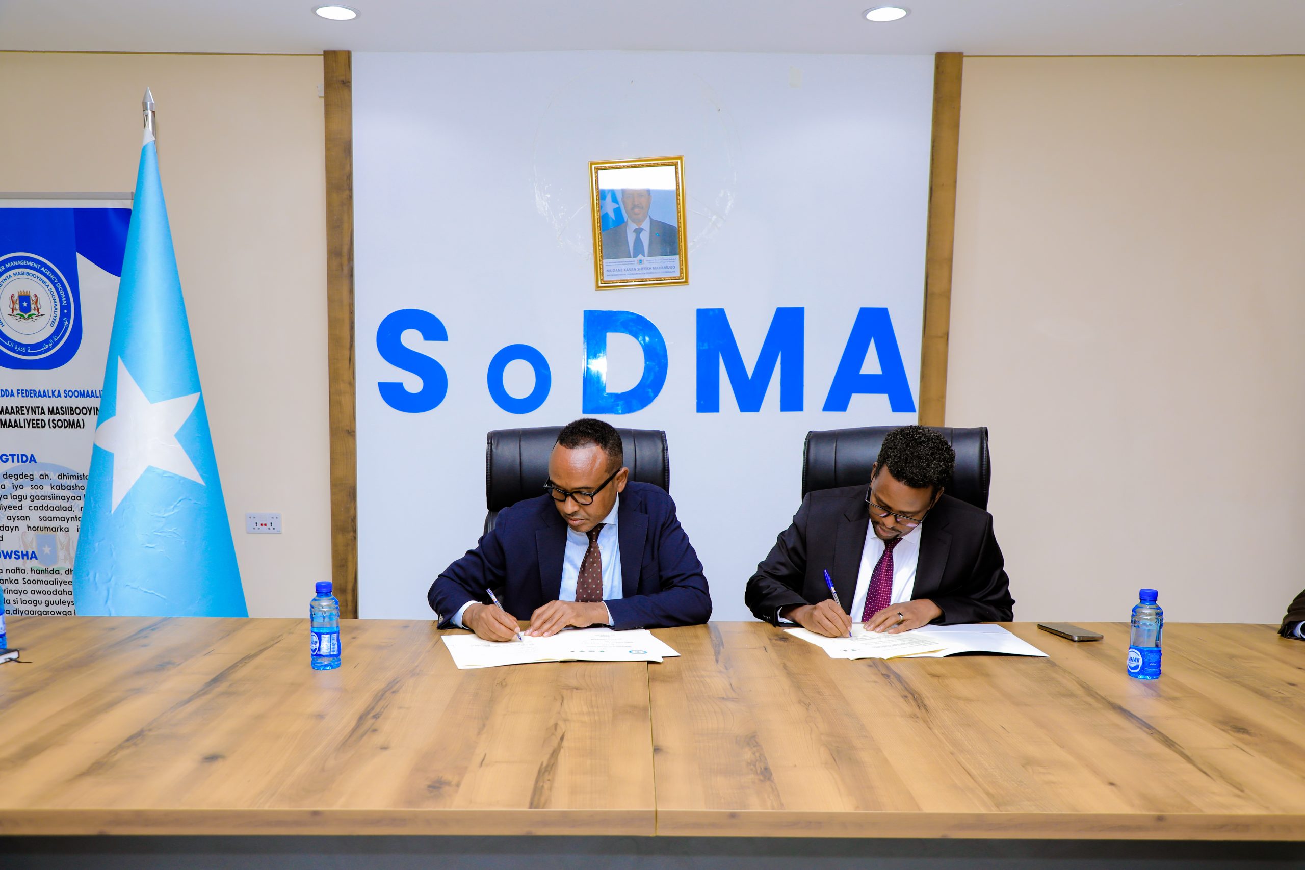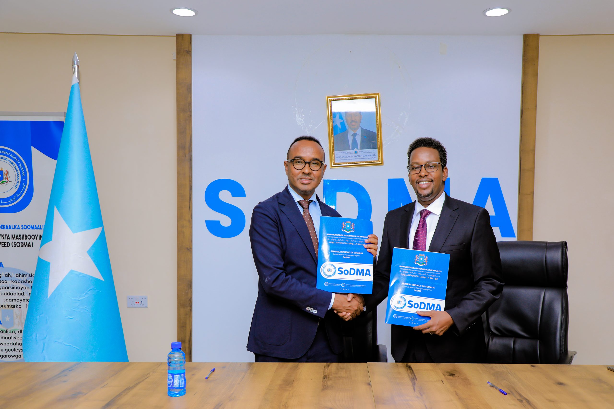 Commissioner Mohamoud Moallim Abdulle and the Rector of the University of Simad, Abdikarim Mohaid, who was representing the Universities Consortium for Disaster and Climate Resilience, jointly signed the MoU at SODMA headquarters in Mogadishu.