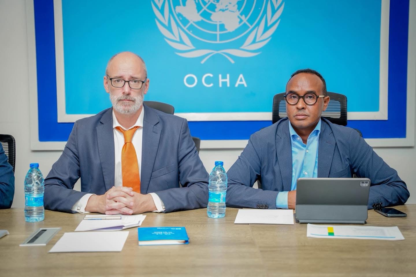 Guddoomiyaha Hay’adda Maareynta Musiibooyinka Qaranka SoDMA, Mudane Maxamuud Macalin Cabdulle, iyo Ku-xigeenka Ergeyga Xoghayaha Guud ee QM ee Soomaaliya, Mudane George Conway, ayaa si wadajir ah u guddoomiyay kulan lagu falanqeeyay abaarta dalka soo wajahday.