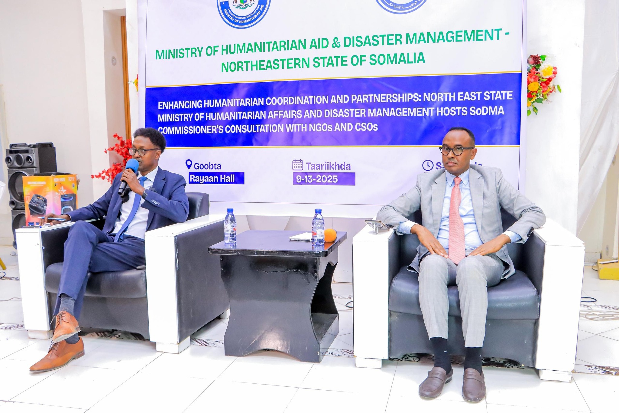 LAS ANOD, SOMALIA — In a proactive step to enhance humanitarian work, the Ministry of Humanitarian Aid & Disaster Management – Northeastern State of Somalia hosted an exceptional meeting at Rayaan Hall in Las Anod on September 13, 2025. The consultation, titled “Enhancing Humanitarian Coordination and Partnerships,” brought together a group of government leaders and humanitarian partners, led by the Commissioner of the Somali Disaster Management Agency (SoDMA), Mr. Mohamud Moallim Abdulle.
