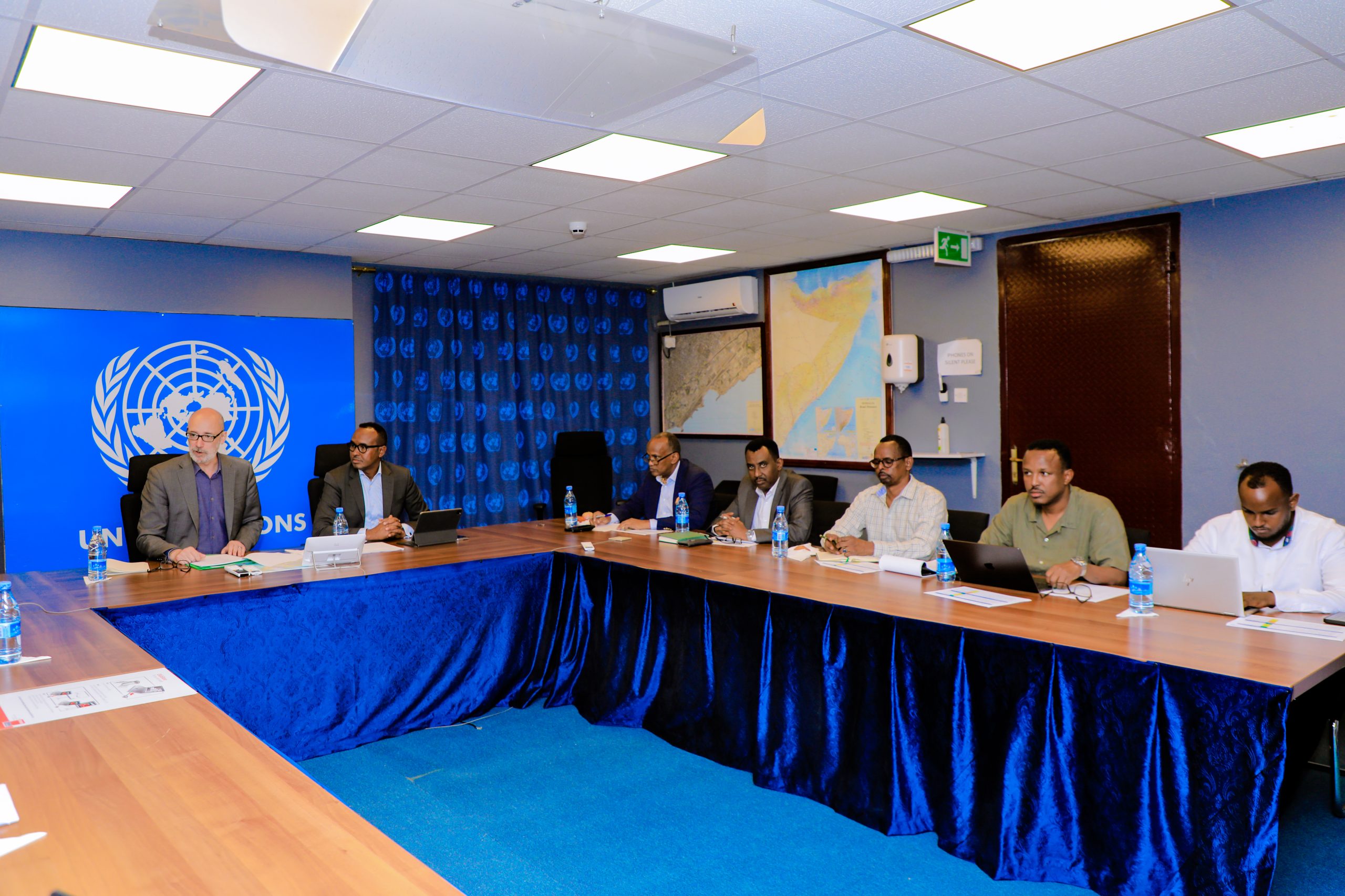 Commissioner Mahamuud Moallim and Georgy Conway UN, the DSRSG of UN in Somalia, co-chaired a monthly meeting aimed at reviewing the ongoing humanitarian situation in the country with other partners, including OCHA Somalia, UNDP Somalia, and FAO Somalia.