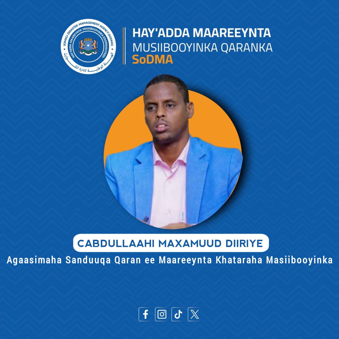 MUQDISHO, SOOMAALIYA – Guddoomiyaha Hay’adda Maareynta Masiibooyinka Soomaaliyeed (SoDMA), Mudane Maxamuud Macalin Cabdulle, ayaa maanta ku dhawaaqay magacaabista Mudane Cabdullahi Maxamuud Diiriye, oo loo magacaabay Agaasimaha Sanduuqa Maareynta Khataraha Masiibooyinka Qaranka. Talaabadan istiraatiijiga ah waa mid lagu dhammaystirayo dadaalka hay’adda ee dhisidda nidaam qaran oo isku-dhafan oo loogu talagalay jawaab-celinta masiibooyinka, waana mid waafaqsan shuruudaha ku xusan Sharciga Lr. 17. Gaar ahaan, Qodobka 8aad ee sharciga ayaa aasaasaya qaab-dhismeed maaliyadeed si loo hubiyo jawaab degdeg ah xaaladaha degdegga ah ee qaranka.