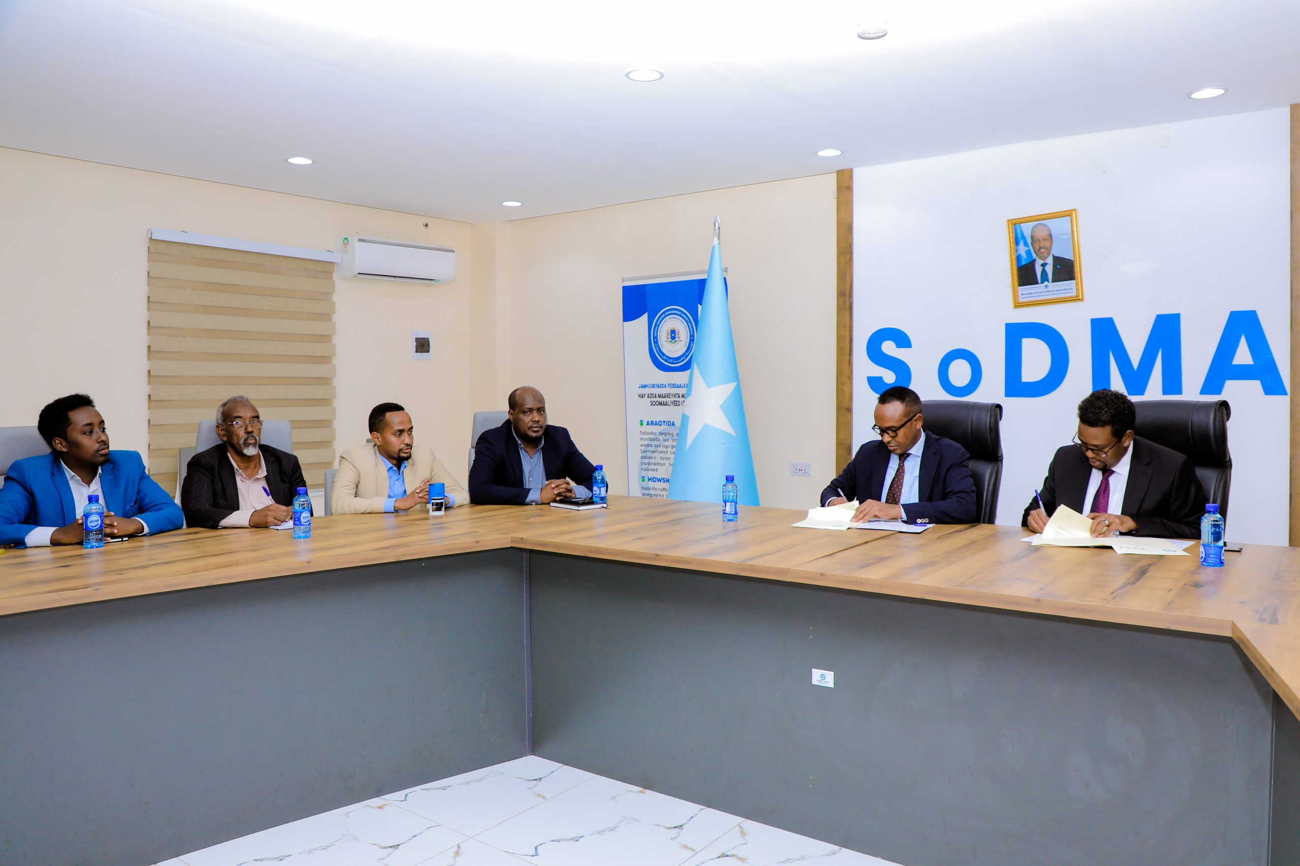 Commissioner Mohamoud Moallim Abdulle and the Rector of the University of Simad, Abdikarim Mohaid, who was representing the Universities Consortium for Disaster and Climate Resilience, jointly signed the MoU at SODMA headquarters in Mogadishu.